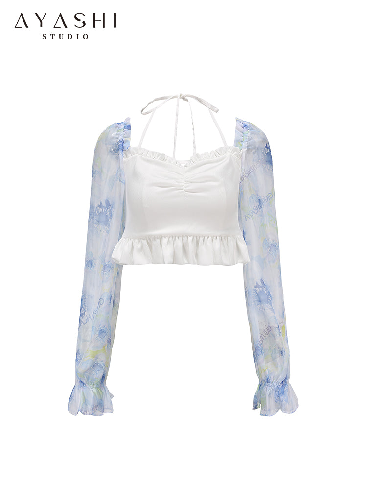 Blue Printed Chiffon Balloon Sleeve Top
