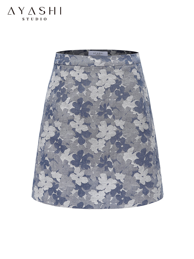 Blue Floral Jacquard A-Line Skirt