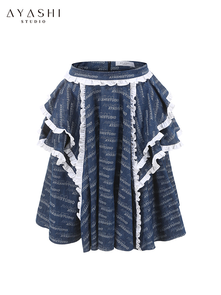 Alphabet Jacquard Ruffled Denim Skirt