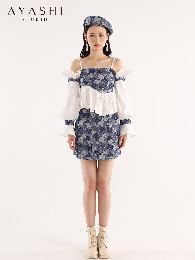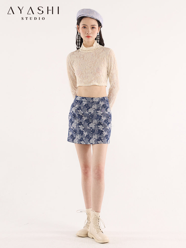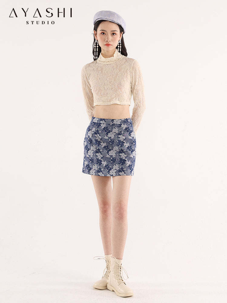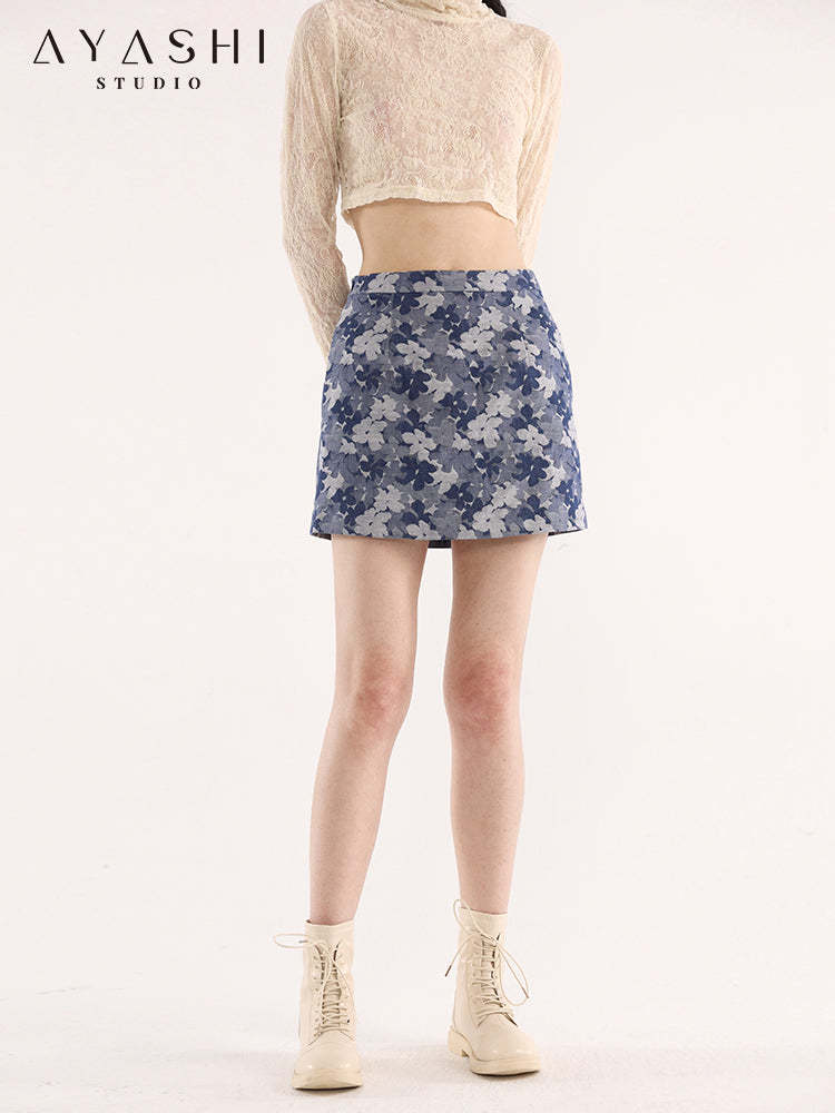 Blue Floral Jacquard A-Line Skirt